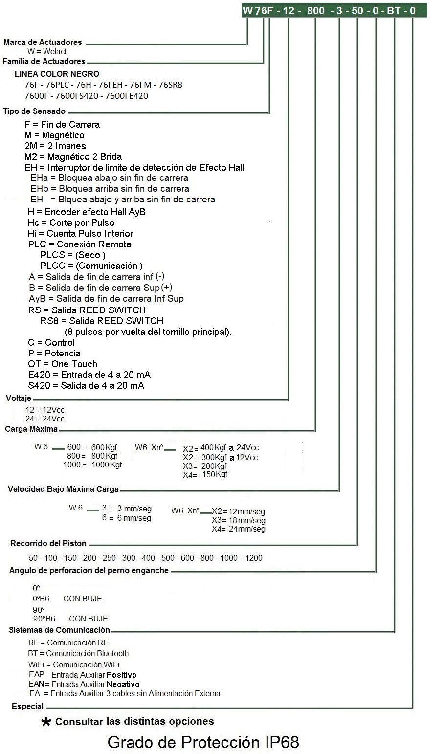 Estas flamantes Familias Welact 76F-Welact 76FPLC-Welact 76H-Welact 76EH-Welact 76M-Welact 7600-Welact 76RS de Actuadores Eléctricos Lineales Toma Lateral de uso Agricola-Industriales o Viales fueron diseñadas para necesidades de bajo nivel sonoro, gran robustez a la tracción-compresión (1200 kg), alto nivel de protección contra el medio ambiente IP 68, protección a los agentes químicos (hidrocarburos, fertilizantes), alta variedad de recorridos hasta 1000mm., fuerzas hasta 1000 kg. Con un Duty Cycle del 10%, Se los puede ordenar con Finales de Carrera Eléctricos W76F, Potenciometro W7600, Encoder Efecto Hall A y B W76H, Salida Reed Switch W76RS, Antigiro en el vástago, Magnético W76M (Sensor Magnético Mod. DSM 8 ), Detección Efecto Hall W76EH. Además tienen varias configuraciones de electrónica. Carcaza Exterior construída en Plástico de Alta resistencia.